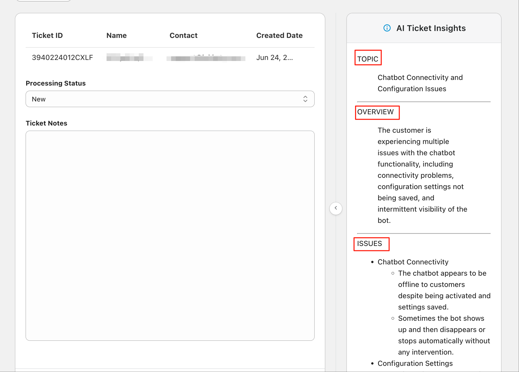 This information is very useful: when the customer inquires about their ticket again using the same ticket ID in the chat, the AI will automatically inform them of the latest progress you have recorded.