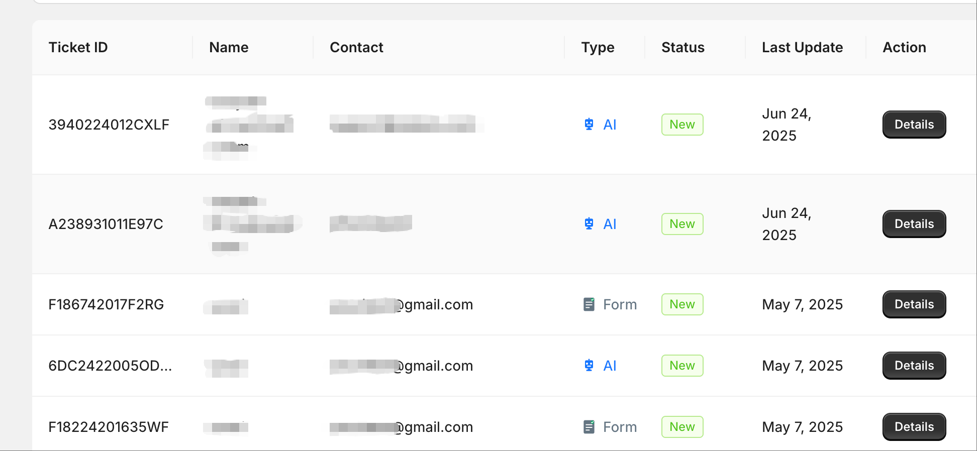 When the AI analyzes a conversation and determines that a complex issue requires manual follow-up, it will automatically create a ticket. In the ticket list, tickets with type: ai are those submitted automatically by the AI, while those with type: form are submitted manually by the customer.