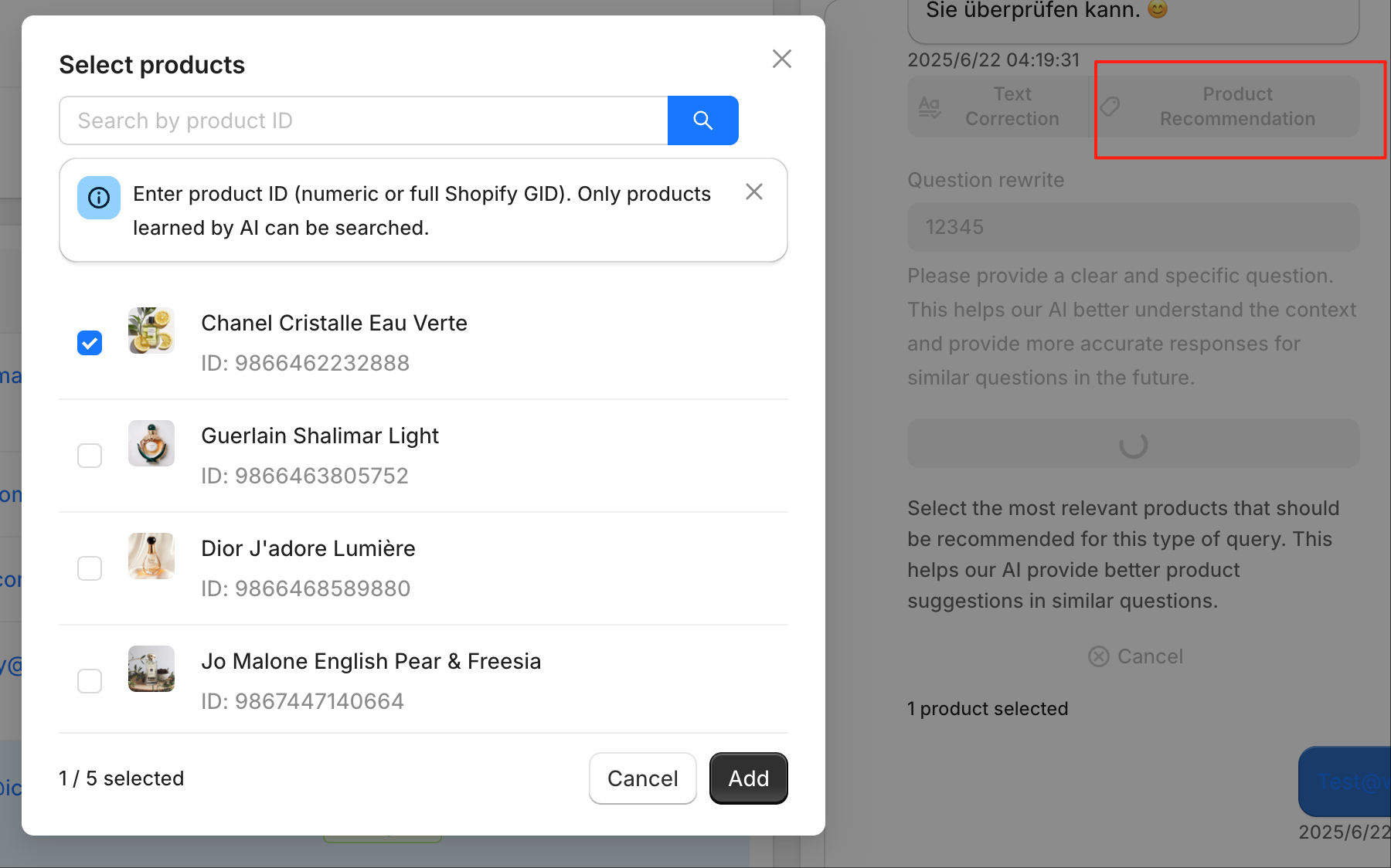 Thanks to our deep integration with Shopify, you can also correct product recommendations. If you believe the AI should have recommended a different product, you can directly correct the product recommendation. Tell the AI which product(s) it should have suggested instead. You can select up to 5 products for the correction.