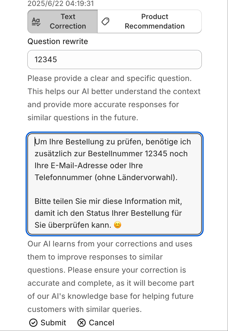 While reviewing conversations between the AI and customers, if you find a response unsatisfactory, simply click the "Correction" button. Manually enter the answer you would prefer. In the future, when faced with a similar question, the AI will reference your corrected response to provide a better answer.