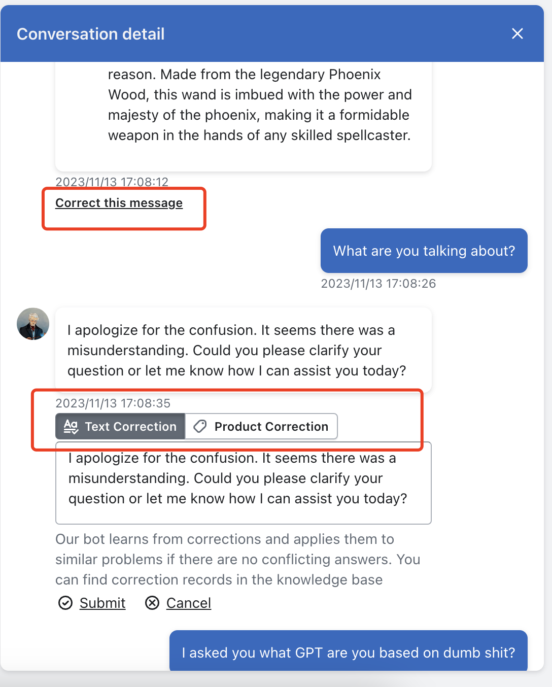 If you are unsatisfied with the AI's response, you can click "correct this message." Then you will see options for text correction or product correction.