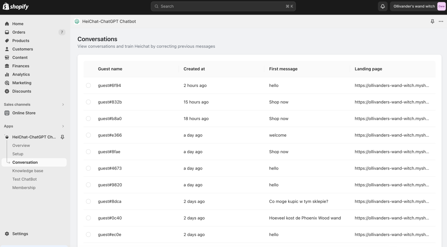 "landing page" refers to the page on which the customer entered the store and started the conversation with customer service.
