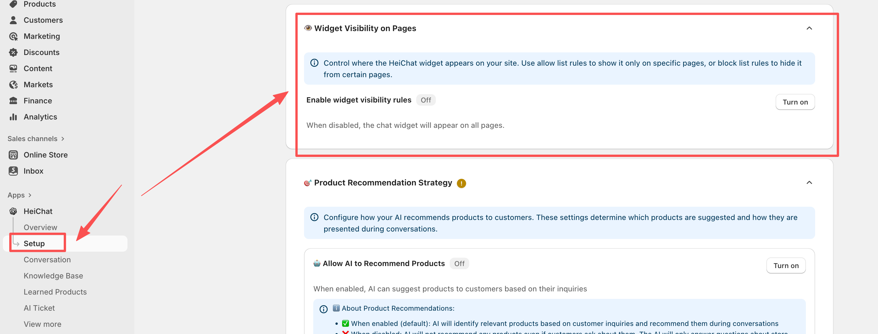 HeiChat's "Widget Visibility on Pages" feature gives you precise control over where your chat widget is displayed on your website. By default, the HeiChat widget appears on all pages. However, with this feature, you can define specific rules to show or hide the widget based on your URL structure.