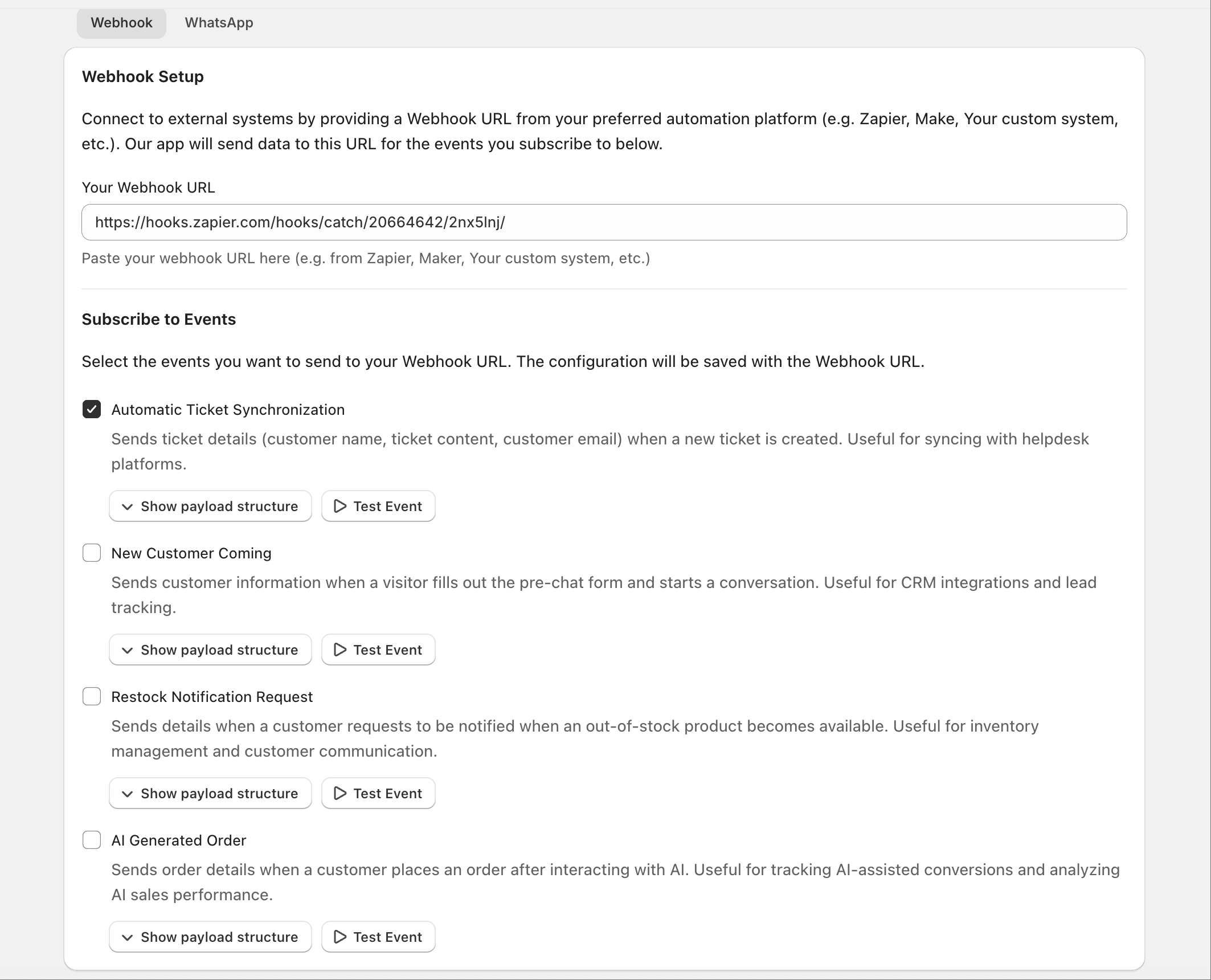 You can complete the webhook setup with simple configurations, requiring no development work. This allows you to integrate HeiChat's events directly into your existing helpdesk ecosystem (like Zendesk, Gorgias, etc.) without leaving your workflow. You can continue to use HeiChat as the primary AI for customer interactions on your Shopify store while managing the outcomes in your central support system.